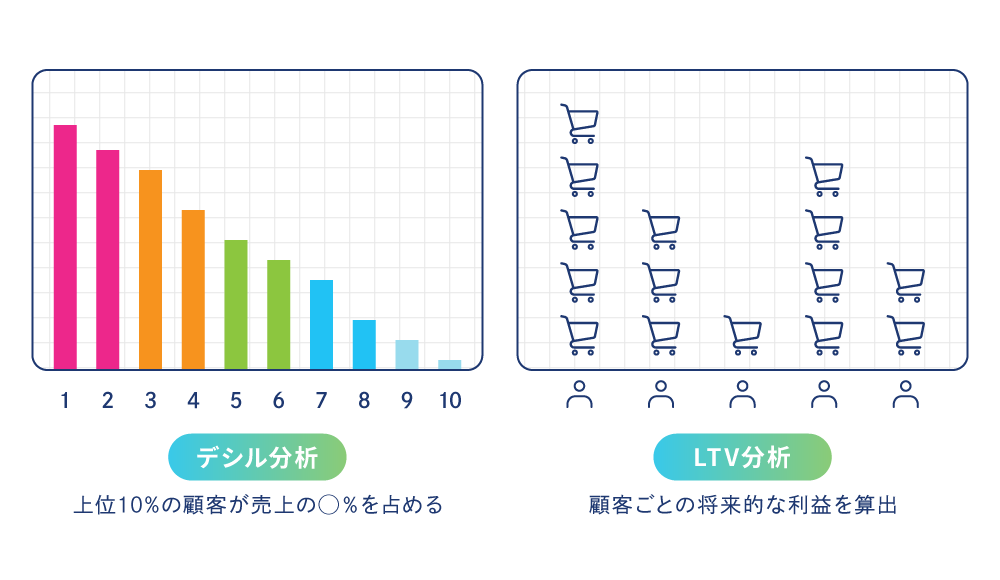 • LTV分析:一人の顧客が生涯にわたり自社にもたらす利益を算出し、関係維持・強化の戦略に役立てます。