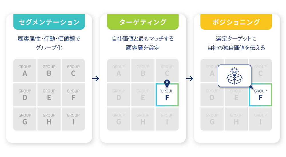 • Targeting(ターゲティング):細分化した市場から、自社が最もアプローチすべきセグメントを選定します。