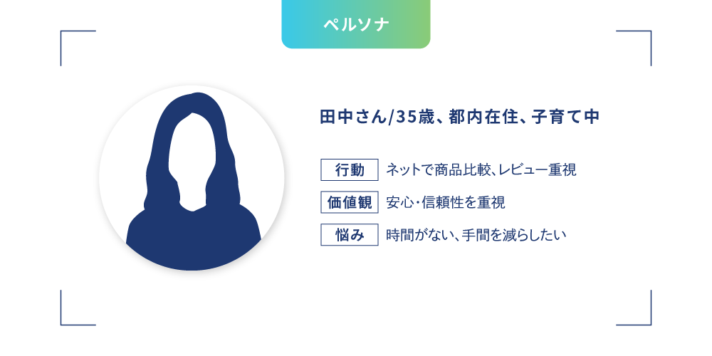 • 詳細な人物像:年齢、職業、家族構成に加え、性格、ライフスタイル、趣味、価値観、悩み、情報収集方法まで設定します。